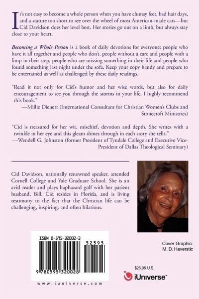 It's not easy to become a whole person when you have clumsy feet, bad hair days, and a stature too short to see over the wheel of most American-made cars--but Cid Davidson does her level best. Her stories go out on a limb, but always stay close to your heart. Becoming a Whole Person is a book of daily devotions for everyone: people who have it all together and people who don't, people without a care and people with a limp in their step, people who are missing something in their life and people who found something last night under the sofa. Keep your copy handy and prepare to be entertained as well as challenged by these daily readings. "Read it not only for Cid's humor and her wise words, but also for daily encouragement to see you through the storms in your life. I highly recommend this book."--Millie Dienert (International Consultant for Christian Women's Clubs and Stonecroft Ministries) "Cid is treasured for her wit, mischief, devotion and depth. She writes with a twinkle in her eye and this gleam shines through in each story she tells."--Wendell G. Johnston (former President of Tyndale College and Executive Vice-President of Dallas Theological Seminary)