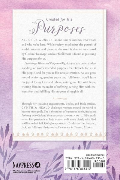 Women sometimes wonder, Who am I? Why am I here? While society emphasizes wealth, success, and the pursuit of pleasure, the truth is that we are created by God in His image, and our fulfillment is found in pursuing His purposes for us. In 11 sessions, Becoming a Woman of Purpose topical Bible study by Navigator author and Bible teacher Cynthia Heald will guide you to a better understanding of your identity, God's will, and His intended purpose for you as His unique creation. If using in a group, personal study is needed between meetings.