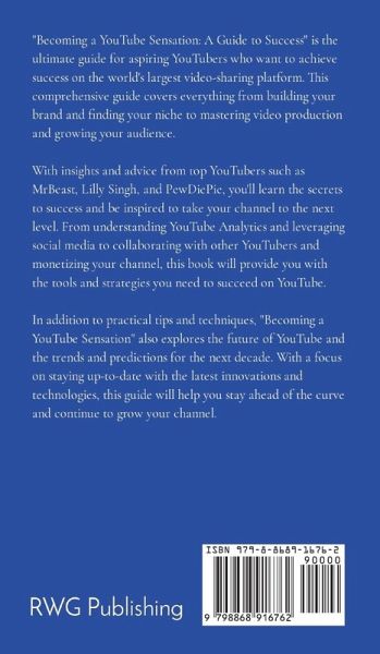"Becoming a YouTube Sensation: A Guide to Success" is the ultimate guide for aspiring YouTubers who want to achieve success on the world's largest video-sharing platform. This comprehensive guide covers everything from building your brand and finding your niche to mastering video production and growing your audience. With insights and advice from top YouTubers such as MrBeast, Lilly Singh, and PewDiePie, you'll learn the secrets to success and be inspired to take your channel to the next level. From understanding YouTube Analytics and leveraging social media to collaborating with other YouTubers and monetizing your channel, this book will provide you with the tools and strategies you need to succeed on YouTube. In addition to practical tips and techniques, "Becoming a YouTube Sensation" also explores the future of YouTube and the trends and predictions for the next decade. With a focus on staying up-to-date with the latest innovations and technologies, this guide will help you stay ahead of the curve and continue to grow your channel. Whether you're a beginner or an experienced YouTuber, "Becoming a YouTube Sensation" is the ultimate guide to achieving success on YouTube. With actionable advice, inspiring stories, and valuable insights, this book will help you take your channel to the next level and achieve your dreams of becoming a YouTube sensation.