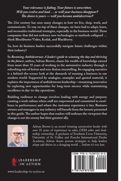 Your relevance is fading. Your future is unwritten. Will you evolve and lead ... or will your business disappear? The choice is yours - will you become ambidextrous? The 21st century has seen many changes in how we live, shop, work, and communicate. To stay on top of these changes, we have had to adapt, learn, and reconsider traditional strategies, especially in the business world. Those companies that did not embrace new technologies or methods collapsed ... think Blockbuster Video, Kodak, and Blackberry. So, how do business leaders successfully navigate future challenges within their industry? In Becoming Ambidextrous: A leader's guide to winning the day and thriving in the future, author, Adrian Brown, shares his wealth of knowledge earned from more than 35 years of working in the automotive industry through a refreshing mix of fiction and non-fiction storytelling. Its engaging narrative is a behind-the-scenes look at the demands of running a business in our modern world. Supported by analogies, examples and quoted material, it explains the importance of ambidextrous leadership-remaining innovative by exploring new opportunities for long-term success while maintaining excellence in day-to-day operations. Building resilience to change involves leading with energy and purpose; creating a work culture where staff are empowered and committed to excellence in performance; and where the customer experience is key. Business owners and managers in any industry will benefit from the lessons presented in this guide. The author hopes that readers will embrace the viewpoint that change is not the enemy but their greatest ally.