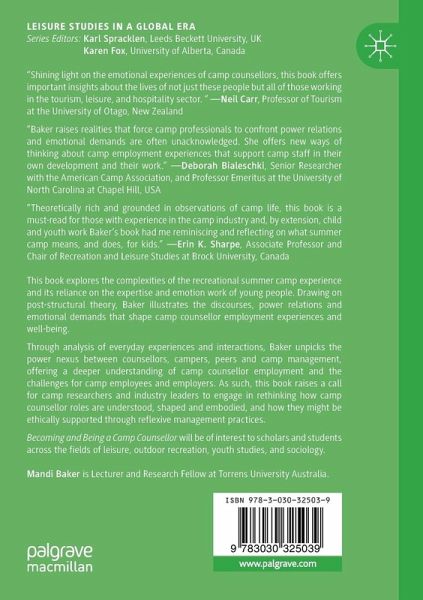 Through analysis of everyday experiences and interactions, Baker unpicks the power nexus between counsellors, campers, peers and camp management, offering a deeper understanding of camp counsellor employment and the challenges for camp employees and employers. As such, this book raises a call for camp researchers and industry leaders to engage in rethinking how camp counsellor roles are understood, shaped and embodied, and how they might be ethically supported through reflexive management practices.