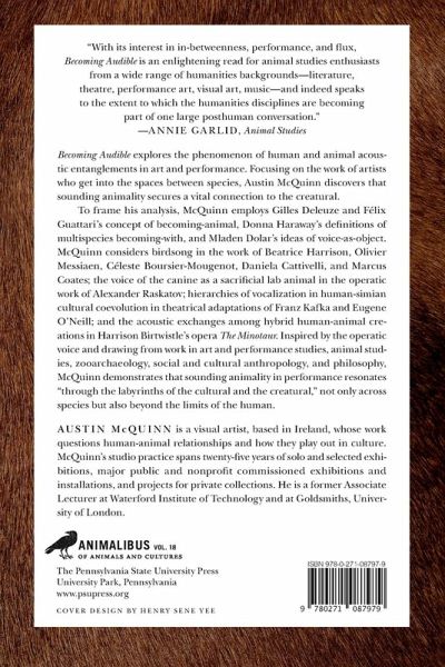 Becoming Audible explores the phenomenon of human and animal acoustic entanglements in art and performance practices. Focusing on the work of artists who get into the spaces between species, Austin McQuinn discovers that sounding animality secures a vital connection to the creatural. To frame his analysis, McQuinn employs Gilles Deleuze and Félix Guattari's concept of becoming-animal, Donna Haraway's definitions of multispecies becoming-with, and Mladen Dolar's ideas of voice-as-object. McQuinn considers birdsong in the work of Beatrice Harrison, Olivier Messiaen, Céleste Boursier-Mougenot, Daniela Cattivelli, and Marcus Coates; the voice of the canine as a sacrificial lab animal in the operatic work of Alexander Raskatov; hierarchies of vocalization in human-simian cultural coevolution in theatrical adaptations of Franz Kafka and Eugene O'Neill; and the acoustic exchanges among hybrid human-animal creations in Harrison Birtwistle's opera The Minotaur. Inspired by the operatic voice and drawing from work in art and performance studies, animal studies, zooarchaeology, social and cultural anthropology, and philosophy, McQuinn demonstrates that sounding animality in performance resonates "through the labyrinths of the cultural and the creatural," not only across species but also beyond the limits of the human. Timely and provocative, this volume outlines new methods of unsettling human exceptionalism during a period of urgent reevaluation of interspecies relations. Students and scholars of human-animal studies, performance studies, and art historians working at the nexus of human and animal will find McQuinn's book enlightening and edifying.