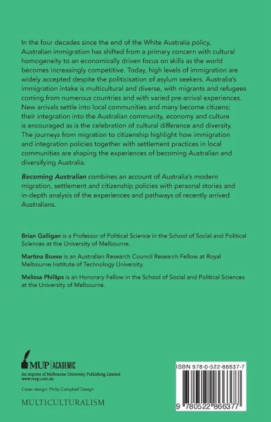The year 2013 is the 40th anniversary of the end of the 'White Australia policy'. In these four decades Australia's immigration policy has shifted from a primary concern with cultural homogeneity or Britishness to a focus on demand-based skills through an increasingly fine-tuned system of points tests, occupation lists and employer-sponsored visas. Despite disproportionate politicisation of asylum seekers in recent public discourse, the intake of refugees and humanitarian entrants has remained relatively small. While Australia's contemporary migrant and refugee intake is truly multicultural, and governments continue to adhere to an official multicultural policy, integration into the Australian community and culture has been the dominant process, especially for second and third generation Australians. Australian identity and citizenship have changed in the last forty years, making Australia and its people more pluralistic and richly diverse. Becoming Australian focuses on the ways in which migrants and refugees meet the challenges of 'becoming Australian' and the transformative process for Australia and its people as they incorporate the continuing influx of multicultural peoples.