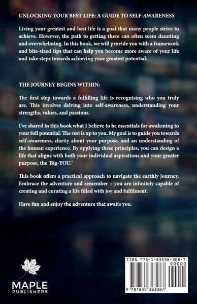Unlock the transformative power of your true self-learn to collaborate with your innate guide, the Big-YOU, and embark on a journey toward clarity, purpose, and an authentic life. Becoming Aware of THE BIG-YOU covers my entire journey: - my 'A-ha!' moment didn't come with fanfare or a grand revelation, but rather as a quiet understanding that led me to a surprisingly effective remedy and how I got my life back on track. In This Book, You'll Discover: How to connect with your intuition, instinct and inner wisdom, referred to as the Big-YOU, and foster a conscious relationship that enables you to design the life you desire. (Chapter 1) The Big-YOU is the ultimate life companion, an unshakeable co-pilot ready to guide and uplift you through even the darkest of times - if you only learn to listen to its' wise and comforting voice. (Chapter 2) Imagine a life filled with fulfilling relationships, financial security, vibrant health, and rewarding experiences-all by learning the strategies to collaborate with the powerful inner wisdom of the Big-YOU. (Chapter 2 and 3) Effective techniques for remaining unaffected by negative emotions, thoughts, and feelings and other revelations that spark our understanding of what it truly means to be alive. (Chapter 4) Ways to experience unconditional love, peace, and joy in the present moment, regardless of external circumstances. (Chapter 4) Insight into why your 'manifestations' may not be working, and how it is the Big-YOU whose role it is to manipulate energy, frequencies and vibrations to create the events that you experience - this book reveals the process! (Chapter 4) Techniques to release anxiety, self-doubt, self-sabotage, and destructive behaviours. (Chapter 4) Approaches to effortlessly create from a mindset of abundance, flow, and ease. (Chapter 5) No matter your past, your origins, or your experiences, happiness, unconditional love, and a profound sense of fulfilment are attainable for everyone. The pursuit of an extraordinary life resonates with many, yet the path may seem daunting. This book provides a structured yet digestible set of strategies to elevate your self-awareness and empower you to realise your highest potential. In these pages, you will discover valuable insights crucial for connecting with your TRUE SELF and nurturing a life filled with meaning and adventure, one that enriches both you and the world around you. This book is crafted to guide you beyond superficial thinking, leading you to the profound truths that have always resided deep within your soul - The Big-YOU.