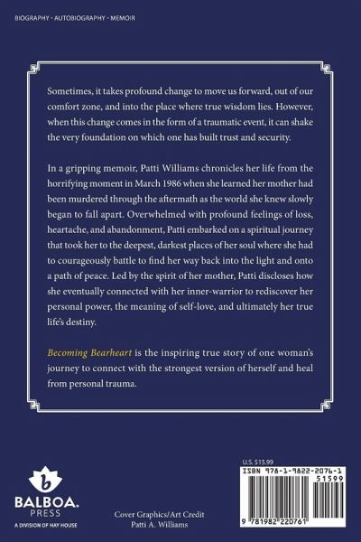 Sometimes, it takes profound change to move us forward, out of our comfort zone, and into the place where true wisdom lies. However, when this change comes in the form of a traumatic event, it can shake the very foundation on which one has built trust and security. In a gripping memoir, Patti Williams chronicles her life from the horrifying moment in March 1986 when she learned her mother had been murdered through the aftermath as the world she knew slowly began to fall apart. Overwhelmed with profound feelings of loss, heartache, and abandonment, Patti embarked on a spiritual journey that took her to the deepest, darkest places of her soul where she had to courageously battle to find her way back into the light and onto a path of peace. Led by the spirit of her mother, Patti discloses how she eventually connected with her inner-warrior to rediscover her personal power, the meaning of self-love, and ultimately her true life's destiny. Becoming Bearheart is the inspiring true story of one woman's journey to connect with the strongest version of herself and heal from personal trauma.