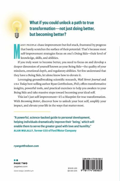 What if you could unlock a path to realizing true personal transformation-not just doing better, but becoming better? Many people chase improvement but remain stuck, frustrated by progress that feels incremental at best. That's because most self-improvement strategies focus on one's Doing Side-their level of knowledge, skills, and abilities. While valuable, this approach only scratches the surface of what's possible. In Becoming Better, Wall Street Journal and USA Today best-selling author Ryan Gottfredson, PhD, teaches you that transformational growth requires a shift to a deeper dimension known as your Being Side-the quality of your mindsets, emotional depth, and regulatory abilities. It is this unseen foundation that shapes how you experience the world and how the world experiences you. But few understand their Being Side, let alone how to elevate it. Through this book, you'll learn how to unlock the power of your Being Side to step into your ideal self. Leveraging groundbreaking scientific research, Gottfredson provides cutting-edge guidance, powerful tools, and practical exercises to help you learn: - What your Being Side is and why it matters. - How to assess the current quality of your Being Side. - Proven strategies to upgrade your Being Side. This journey is about more than self-improvement-it's a blueprint for truly elevating your life, your impact, and your being. If you're ready to become not just a better doer but a better being, this book will show you the way.
