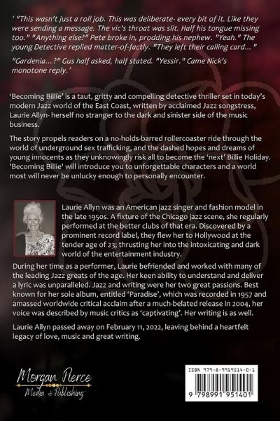 'Becoming Billie' is a taut, gritty, and compelling detective thriller set in today's modern Jazz world of the East Coast. Written by acclaimed Jazz songstress Laurie Allyn- herself no stranger to the dark and sinister side of the music business, the story propels readers on a no-holds-barred rollercoaster ride through the world of underground sex trafficking and the dashed hopes and dreams of young innocents as they unknowingly risk all to become the 'next' Billie Holiday. 'Becoming Billie' will introduce you to unforgettable characters and a world most will never be unlucky enough to personally encounter. If you're looking for a riveting, well-crafted page-turner to read in front of the fireplace on a stormy night- you've found it!