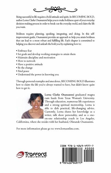 Being successful in life requires a bold attitude and spirit. In Becoming Bold, author Lorna Osunsanmi helps you to make boldness a part of your everyday decision-making process in order to claim the life you want. Boldness requires planning, speaking, integrating, and doing. In this self-improvement guide, Osunsanmi provides an approach to help you attain boldness that can lead to a more robust, rich, and fulfilling life. Each chapter is committed to helping you discover your boldness by ¿ erasing fear; ¿ setting goals and developing working strategies; ¿ maintaining discipline and motivation; ¿ going the distance and working hard; ¿ doing the right thing; ¿ showing positive character; ¿ being the change; ¿ finding peace. Through personal examples and anecdotes, Becoming Bold shows you how overcome fear, identify goals, form the mindset to inspire change, and move forward with those goals to claim the life you want to have.