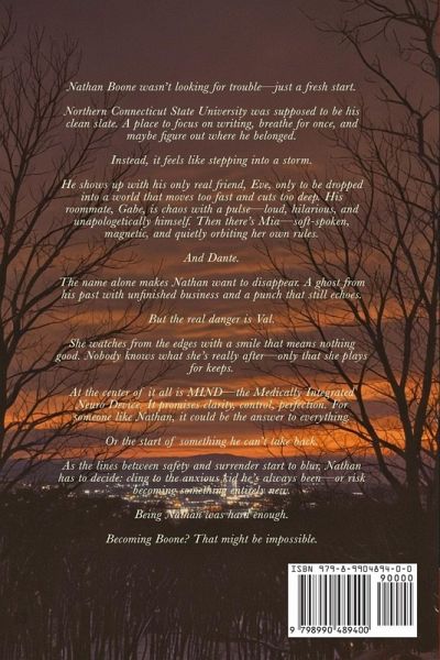 Nathan Boone wasn't looking for trouble-just a fresh start. Northern Connecticut State University was supposed to be his clean slate. A place to focus on writing, breathe for once, and maybe figure out where he belonged. Instead, it feels like stepping into a storm. He shows up with his only real friend, Eve, only to be dropped into a world that moves too fast and cuts too deep. His roommate, Gabe, is chaos with a pulse-loud, hilarious, and unapologetically himself. Then there's Mia-soft-spoken, magnetic, and quietly orbiting her own rules. And Dante. The name alone makes Nathan want to disappear. A ghost from his past with unfinished business and a punch that still echoes. But the real danger is Val. She watches from the edges with a smile that means nothing good. Nobody knows what she's really after-only that she plays for keeps. At the center of it all is MIND-the Medically Integrated Neuro Device. It promises clarity, control, and perfection. For someone like Nathan, it could be the answer to everything. Or the start of something he can't take back. As the lines between safety and surrender start to blur, Nathan has to decide: cling to the anxious kid he's always been-or risk becoming something entirely new. Being Nathan was hard enough. Becoming Boone? That might be impossible.