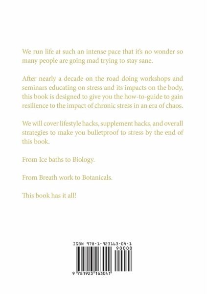 We run life at such an intense pace that it's no wonder so many people are going mad trying to stay sane. After nearly a decade on the road doing workshops and seminars educating on stress and its impacts on the body, this book is designed to give you the how-to-guide to gain resilience to the impact of chronic stress in an era of chaos. We will cover lifestyle hacks, supplement hacks, and overall strategies to make you bulletproof to stress by the end of this book. From Ice baths to Biology. From Breath work to Botanicals. This book has it all!
