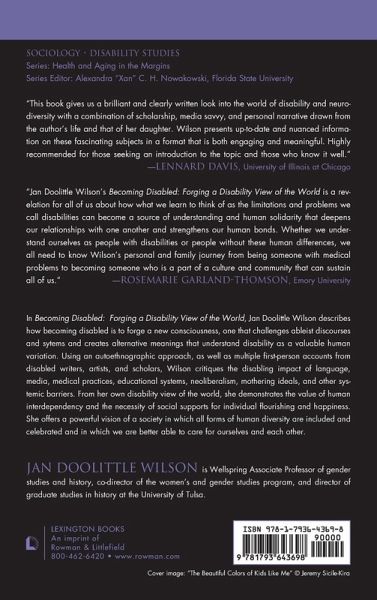 Using an autoethnographic approach, as well as multiple first-person accounts from disabled writers, artists, and scholars, Jan Doolittle Wilson describes how becoming disabled is to forge a new consciousness and a radically new way of viewing the world. In Becoming Disabled, Wilson examines disability in ways that challenge dominant discourses and systems that shape and reproduce disability stigma and discrimination. It is to create alternative meanings that understand disability as a valuable human variation, that embrace human interdependency, and that recognize the necessity of social supports for individual flourishing and happiness. From her own disability view of the world, Wilson critiques the disabling impact of language, media, medical practices, educational systems, neoliberalism, mothering ideals, and other systemic barriers. And she offers a powerful vision of a society in which all forms of human diversity are included and celebrated and one in which we are better able to care for ourselves and each other.