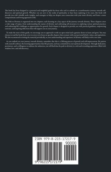 This book has been designed as a practical and insightful guide for those who seek to embark on a transformative journey towards self-discovery and spiritual growth. Whether you are new to the realm of spirituality or have been exploring it for years, this book will provide you with valuable tools, insights, and strategies to help you deepen your connection with your inner divinity and foster a more compassionate and loving approach to life. The Path to Divinity is organized into ten chapters, each focusing on a key aspect of the journey towards divinity. These chapters cover a wide range of topics, from understanding the nature of divinity and cultivating self-awareness to exploring various spiritual practices and embracing life's challenges as opportunities for growth. Each chapter is designed to provide you with practical guidance, empowering exercises, and inspiring reflections that will support you in your journey. To make the most of this guide, we encourage you to approach it with an open mind and a genuine desire to learn and grow. You may choose to read the book from cover to cover or to focus on specific chapters that resonate with your personal beliefs, values, and aspirations. We also recommend revisiting the material periodically, as your understanding and experience of divinity will likely evolve over time. As you embark on your journey towards divinity, remember that this is a lifelong process of growth and self-improvement. Be patient with yourself, embrace the learning opportunities that life presents, and stay committed to your spiritual development. Through dedication, persistence, and a willingness to embrace the unknown, you will find that the path to divinity is a rich and rewarding experience, filled with wisdom, love, and self-discovery.