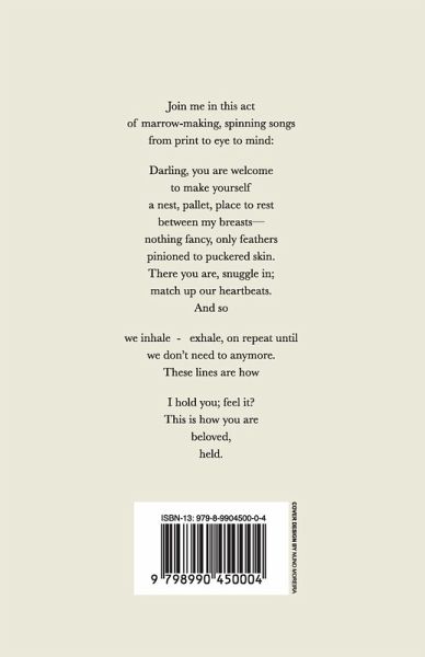 Join me in this actof marrow-making, spinning songsfrom print to eye to mind: Darling, you are welcometo make yourselfa nest, pallet, place to restbetween my breasts-nothing fancy, only featherspinioned to puckered skin.There you are, snuggle in,match up our heartbeats.And so we inhale - exhale, on repeat untilwe don't need to anymore.These lines are how I hold you; feel it?This is how you arebeloved,held.