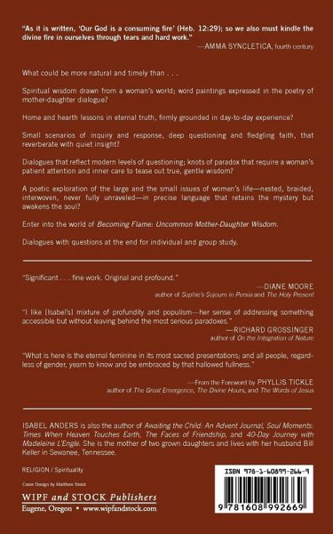 ""As it is written, 'Our God is a consuming fire' (Heb. 12:29); so we also must kindle the divine fire in ourselves through tears and hard work."" --Amma Syncletica, fourth century. What could be more natural and timely than ... Spiritual wisdom drawn from a woman's world; word paintings expressed in the poetry of mother-daughter dialogue? Home and hearth lessons in eternal truth, firmly grounded in day-to-day experience? Small scenarios of inquiry and response, deep questioning and fledgling faith, that reverberate with quiet insight? Dialogues that reflect modern levels of questioning; knots of paradox that require a woman's patient attention and inner care to tease out true, gentle wisdom? A poetic exploration of the large and the small issues of women's life-nested, braided, interwoven, never fully unraveled-in precise language that retains the mystery but awakens the soul? Enter into the world of Becoming Flame: Uncommon Mother-Daughter Wisdom Dialogues with questions at the end for individual and group study.