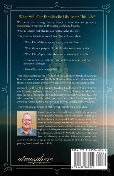 What Will Our Families Be Like After This Life? We desire our strong, loving family connections we presently experience, to continue in the Spirit World and beyond. What is Christ's real plan for our families after this life? This great question is answered here. You will learn about: ¿ What Christ's blessings are for us, now and forever ¿ What the real purpose of this life is for us and our families ¿ What Christ's plan is for those with no family in this life ¿ How we can actually become as Christ is now, and the purpose of doing it ¿ How Christ can lovingly help us This sequel continues the life story of the Wilkinson family, showing us how to become a forever family. It illustrates how we can view ourselves from an even greater perspective, and shows our true missions in life. Included is a thought-provoking Reading Guide, to assist you to have a much better understanding of yourself. You will truly see the great significance of living this life, individually and with your family, along with your incomprehensible potential after this life is completed. Becoming Forever Families will prove to be very beneficial for everyone. This work also promises to make great reading for a book club.