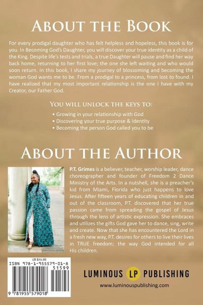 For every prodigal daughter who has felt helpless and hopeless, this book is for you. In Becoming God's Daughter, you will discover your true identity as a child of the King. Despite life's tests and trials, a true Daughter will pause and find her way back home, returning to her first love; the one she left waiting and who would soon return. In this book, I share my journey of blossoming and becoming the woman God wants me to be. From a prodigal to a princess, from lost to found. I have realized that my most important relationship is the one I have with my Creator, our Father God. You will unlock the keys to: ¿ Growing in your relationship with God ¿ Discovering your true purpose & Identity ¿ Becoming the person God called you to be