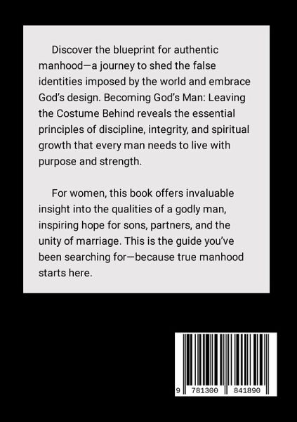 "Becoming God's Man: Leaving the Costume Behind" is a transformative guide for men eager to discover their true identity and live according to God's blueprint for manhood. In this third installment of The Path to True Identity series, Cameron A Bailey Sr unveils the spiritual tools and principles-discipline, self-control, stewardship, husbandry, and dominion-that empower men to discard societal masks and embrace their divine purpose. Through a blend of personal stories, biblical insights, and practical applications, this book illuminates the journey to authentic manhood, guiding readers to shed the worldly costumes that obscure their potential. It's a call to action for men to rise as leaders, fathers, and sons who reflect God's glory in every aspect of their lives. For women, this book offers profound insights into God's design for manhood, providing hope for raising sons and building stronger relationships. Whether you are a man ready to transform or a woman supporting the men in your life, this book delivers timeless wisdom for lasting impact.