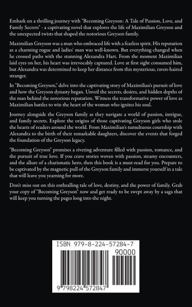 Embark on a thrilling journey with "Becoming Greyson: A Tale of Passion, Love, and Family Secrets" - a captivating novel that explores the life of Maximilian Greyson and the unexpected twists that shaped the notorious Greyson family. Maximilian Greyson was a man who embraced life with a fearless spirit. His reputation as a charming rogue and ladies' man was well-known. But everything changed when he crossed paths with the stunning Alexandra Hart. From the moment Maximilian laid eyes on her, his heart was irrevocably captured. Love at first sight consumed him, but Alexandra was determined to keep her distance from this mysterious, raven-haired stranger. In "Becoming Greyson," delve into the captivating story of Maximilian's pursuit of love and how the Greyson dynasty began. Unveil the secrets, desires, and hidden depths of the man behind the notorious reputation. Witness the transformative power of love as Maximilian battles to win the heart of the woman who ignites his soul. Journey alongside the Greyson family as they navigate a world of passion, intrigue, and family secrets. Explore the origins of those captivating Greyson girls who stole the hearts of readers around the world. From Maximilian's tumultuous courtship with Alexandra to the birth of their remarkable daughters, discover the events that forged the foundation of the Greyson legacy. "Becoming Greyson" promises a riveting adventure filled with passion, romance, and the pursuit of true love. If you crave stories woven with passion, steamy encounters, and the allure of a charismatic hero, then this book is a must-read for you. Prepare to be captivated by the magnetic pull of the Greyson family and immerse yourself in a tale that will leave you yearning for more. Don't miss out on this enthralling tale of love, destiny, and the power of family. Grab your copy of "Becoming Greyson" now and get ready to be swept away by a saga that will keep you turning the pages long into the night.