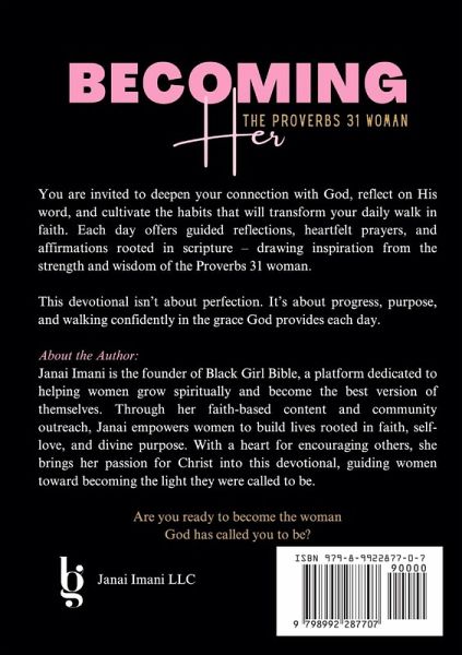 Title: Becoming Her: The Proverbs 31 Woman Description: Step into the journey of becoming the woman God designed you to be. Becoming Her: The Proverbs 31 Woman is a 30-day devotional crafted for women who seek to strengthen their faith, cultivate daily spiritual habits, and walk confidently in their divine purpose. Inspired by the timeless principles of the Proverbs 31 woman, this devotional offers:Daily Reflections - Thought-provoking scriptures paired with practical, real-life applications. Guided Prayers - Heartfelt prayers to align your spirit with God's word. Journaling Prompts - Space to reflect, release, and grow through personal insights. Faith Affirmations - Daily affirmations to inspire and build unwavering confidence in God's promises. Whether you are starting fresh in your faith journey or deepening your existing relationship with God, this devotional will guide you toward becoming the best version of yourself-spiritually, mentally, and emotionally. Transform your mornings, renew your mindset, and embrace the path God has set before you.
