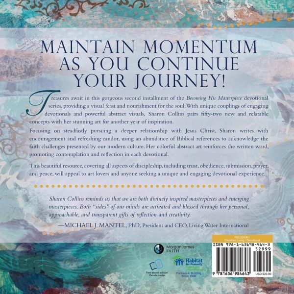 Once again, Sharon Collins delivers fifty-two new devotional and abstract art pairings in the second installment of Becoming His Masterpiece. Through personal reflections and vivid artwork, Sharon encourages followers of Jesus to steadfastly continue their discipleship journey regardless of their circumstances. In a refreshing conversational style, she writes candidly about the joys and challenges of Christian discipleship, using frequent biblical references and her stunning art to connect with her fellow spiritual seekers. Her topics cover all aspects of discipleship, including trust, obedience, submission, prayer, and peace. Christians will find that Becoming His Masterpiece: The Journey Continues is nourishment for the soul and a visual delight. This beautiful resource will appeal to art lovers and anyone seeking a unique and engaging devotional experience.