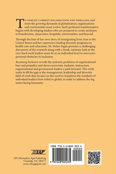 To disrupt current polarization and tribalism, and meet the growing demands of globalization, organizations and communities must evolve. Such profound transformation begins with developing leaders who are prepared to create inclusion in boardrooms, classrooms, hospitals, communities, and beyond. Through the lens of her own story of immigrating from Iran to the United States and her experience leading diversity programs in health care and education, Dr. Helen Fagan presents a challenging discussion of the research along with a frank, intimate look at the very hard work leaders must do at an individual level to overcome personal obstacles to inclusion. Becoming Inclusive reveals the systemic problems of organizational bias and prejudice and shows university students, instructors, organizational and government leaders a path forward. This work seeks to fill the gap in the management, leadership and diversity field of work that focuses on the need to transform the mindsets of individual leaders from tribal to global, in order to address the big issues facing humanity.
