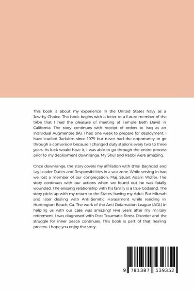 This book is about my experience becoming a Jew-by-Choice while on active duty in the United States Navy. The story continues with orders to Iraq as an Individual Augmentee (IA). While deployed to the Green Zone in Baghdad, Iraq, I became affiliated with B'nai Baghdad. Our congregation lost one member during an attack, Maj. Stuart Adam Wolfer. Our actions upon learning of the situation is detailed in the book. My relationship with his family continues today. While residing in Huntington Beach, Ca., I faced Anti-Semitic harassment and contacted the Anti-Defamation League. Five years after my military retirement, I was diagnosed with Post Traumatic Stress Disorder (PTSD) and the struggle for inner peace is ongoing. This book is part of that healing process. I hope you enjoy the story.