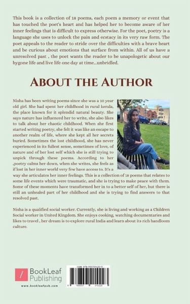 This book is a collection of 18 poems, each poem a memory or event that has touched the poet's heart and has helped her to become aware of her inner feelings that is difficult to express otherwise. For the poet, poetry is a language she uses to unlock the pain and ecstacy in its very raw form. The poet appeals to the reader to stride over the difficulties with a brave heart and be curious about emotions that surface from within. All of us have a unresolved past , the poet wants the reader to be unapologetic about our bygone life and live life one day at time...unbridled.
