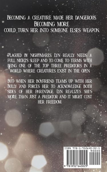 Becoming a creature made her dangerous. Becoming more could turn her into someone else's weapon. Plagued by nightmares, Lyn really needs a full night's sleep and to come to terms with being one of the top three predators in a world where creatures exist in the open. But when her boyfriend teams up with her bully and forces her to acknowledge both sides of her parentage, Lyn realizes she's more than just a predator and it might cost her freedom.