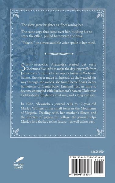 Sixty-year-old Alexandra started out early Christmas Eve 1639 to make the day-long walk from Jamestown, Virginia, to her niece's house in Wolstenholme. She never made it. Instead, as she weaved her way through the woods, she found herself back in her hometown of Canterbury, England, just in time to become entangled with Parliament's ban on Christmas Celebrations, England's civil war, and a long-lost love. In 1982, Alexandra's journal calls to seventeen-year-old Marley Winters in her small town in the Mountains of Virginia. Dealing with her mother's illness and the problem of paying for college, the journal helps Marley find the key to her future as well as her past.
