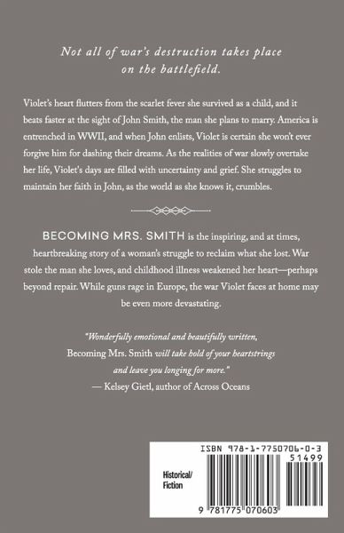 Not all of war's destruction takes place on the battlefield. Violet's heart flutters from the scarlet fever she survived as a child, and it beats faster at the sight of John Smith, the man she plans to marry. America is entrenched in WWII, and when John enlists, Violet is certain she won't ever forgive him for dashing their dreams. As the realities of war slowly overtake her life, Violet's days are filled with uncertainty and grief. She struggles to maintain her faith in John, as the world as she knows it, crumbles. Becoming Mrs. Smith is the inspiring, and at times, heartbreaking story of a woman's struggle to reclaim what she lost. War stole the man she loves, and childhood illness weakened her heart-perhaps beyond repair. While guns rage in Europe, the war Violet faces at home may be even more devastating.
