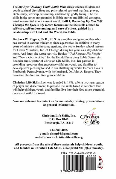 The My Eyes' Journey Youth Battle Plan series teaches children and youth spiritual disciplines and principles of spiritual warfare: prayer, Bible study, worship, fellowship, and healthy, godly living. The life skills in the series are grounded in Bible stories and Biblical concepts, wisdom essential in our current world. Skill 1, Becoming My Best Self Through the Eyes in My Heart, focuses on the life skills related to self-care, self-understanding, and care of others, guided by a relationship with God and His Word, the Bible. Barbara W. Rogers, Ph.D., Ed.S., is a mother and grandmother who has served in various ministries since age twelve. In addition to many years of ministry within congregations, she wrote Sunday school lessons for Urban Ministries, Inc. of Chicago during ten years as a stay-at-home mom. And later, she wrote Activity Books: "God Rescues His People" and "God's Chosen King" for the Herald Press Story Bible Series. As Founder and Director of Christian Life Skills, Inc., her passion is providing resources that encourage children, youth, and families to develop lives pleasing to God in our challenging world. Barbara lives in Pittsburgh, Pennsylvania, with her husband, Dr. John A. Rogers. They have two children and four grandchildren.
