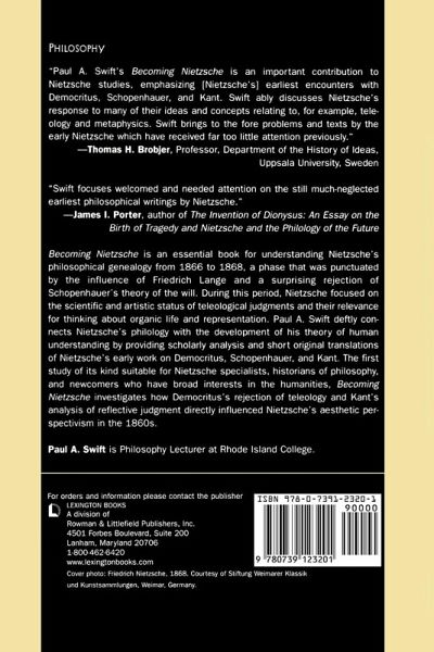 Becoming Nietzsche is an essential book for understanding Nietzsche's philosophical genealogy from 1866D1868, a phase that is punctuated by the influence of Friedrich Lange and a surprising rejection of Schopenhauer's theory of the will. During this phase, Nietzsche focuses on the scientific and artistic status of teleological judgments and their relevance for thinking about organic life and representation.