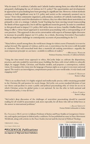 Why do many U.S. residents, Catholics and Catholic leaders among them, too often fall short of adequately challenging the use of violence in U.S. policy? The opportunities and developments in approaches to peacemaking have been growing at a significant rate. However, violent methods continue to hold significant sway in U.S. policy and society as the commonly assumed way to ""peace."" Even when community organizers, policymakers, members of Catholic leadership, and academics sincerely search for alternatives to violence, they too often think about nonviolence as primarily a rule or a strategy. Catholic Social Teaching has been moving toward transcending the limits of these approaches, but it still has significant room for growth. In order to contribute to this growth and to impact U.S. policy, McCarthy draws on Jesus, Gandhi, Ghaffar Khan, and King to offer a virtue-based approach to nonviolent peacemaking with a corresponding set of core practices. This approach is also set in conversation with aspects of human rights discourse to increase its possible impact on U.S. policy. As a whole, Becoming Nonviolent Peacemakers offers an important challenge to contemporary accounts of peacemaking in the U.S.