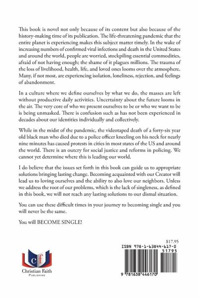 This book is novel not only because of its content but also because of the history-making time of its publication. The life-threatening pandemic that the entire planet is experiencing makes this subject matter timely. In the wake of increasing numbers of confirmed viral infections and death in the United States and around the world, people are worried, stockpiling essential commodities, afraid of not having enough; the shame of it plagues millions. The trauma of the loss of livelihood, health, life, and loved ones looms over the atmosphere. Many, if not most, are experiencing isolation, loneliness, rejection, and feelings of abandonment. In a culture where we define ourselves by what we do, the masses are left without productive daily activities. Uncertainty about the future looms in the air. The very core of who we present ourselves to be or who we want to be is being unmasked. There is confusion such as has not been experienced in decades about our identities individually and collectively. While in the midst of the pandemic, the videotaped death of a forty-six year old black man who died due to a police officer kneeling on his neck for nearly nine minutes has caused protests in cities in most states of the US and around the world. There is an outcry for social justice and reforms in policing. We cannot yet determine where this is leading our world. I do believe that the issues set forth in this book can guide us to appropriate solutions bringing lasting change. Becoming acquainted with our Creator will lead us to loving ourselves and the ability to also love our neighbors. Unless we address the root of our problems, which is the lack of singleness, as defined in this book, we will not reach any lasting solutions to our dismal situation. You can use these difficult times in your journey to becoming single and you will never be the same. You will BECOME SINGLE!