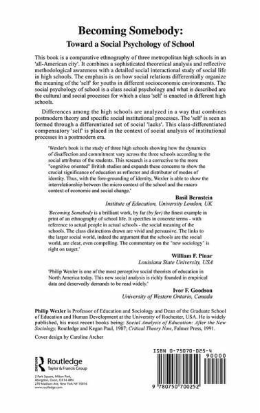 Offers a social psychological account of social life in three high schools, combining theoretical analysis with reflective methodology. The emphasis of the book is on how social relations have varying effects on the feeling of "self" in young people from different socioeconomic environments.
