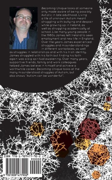 Becoming Unique looks at someone only made aware of being possibly Autistic in late adulthood. Living a life of unknown Autism meant struggling with bullying and despair while growing up in Ireland, as well as struggling academically at school. Like many young people in the 1980s James left Ireland to seek employment and new life in England. Over the years James experienced struggles and misunderstandings in different workplaces, as well as struggles in relationships and with his Irish identity. James struggled with his faith but finding his faith again was a big spiritual awakening. Over many years, supportive friends, family and work colleagues helped James believe in himself and achieve a worthwhile career. Becoming Unique looks at the many misunderstood struggles of Autism, but also shows "Autism can be wonderful".
