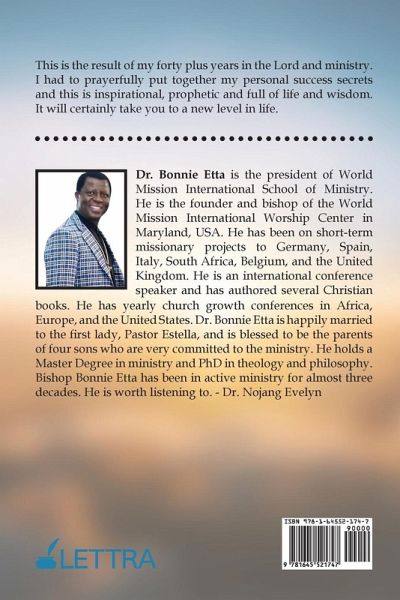 This is the result of my forty plus years in the Lord and ministry. I had to prayerfully put together my personal success secrets and this is inspirational, prophetic and full of life and wisdom. It will certainly take you to a new level in life. Dr. Bonnie Etta is the president of World Mission International School of Ministry. He is the founder and bishop of the World Mission International Worship Center in Maryland, USA. He has been on short-term missionary projects to Germany, Spain, Italy, South Africa, Belgium, and the United Kingdom. He is an international conference speaker and has authored several Christian books. He has yearly church growth conferences in Africa, Europe, and the United States. Dr. Bonnie Etta is happily married to the first lady, Pastor Estella, and is blessed to be the parents of four sons who are very committed to the ministry. He holds a Master Degree in ministry and PhD in theology and philosophy. Bishop Bonnie Etta has been in active ministry for almost three decades. He is worth listening to. - Dr. Nojang Evelyn