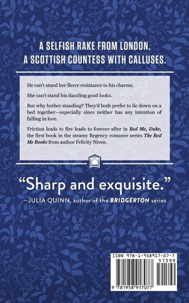 A desperate Scottish countess seeks lessons from a gorgeous rogue. He can't stand her fierce resistance to his charms. She can't stand his dazzling good looks. But why bother standing when they'd both prefer to lie down on a bed together? Especially since neither has any intention of falling in love. Captain Jack Pike leads a blissfully carefree existence as London's richest and most notorious rake. Becoming the Duke of Dunmore would ruin his fun. He doesn't even know where Dunmore is-Scotland, maybe? To add insult to injury, the savage Countess of Kinmarloch refuses to swoon for him. But why should he care? Jack only beds women married to other men, after all, and there's not a man in the British Empire brave enough to wed the feral countess. A countess in her own right, Helen Boyd must marry the new Duke of Dunmore to save the people of Kinmarloch from starvation. If only the troublesome Jack Pike would go away and stop torturing her with his handsome face, perfect male body, and shameless flirtation. On the other hand, Jack might be just the man to teach the woefully inexperienced Helen a thing or two about seducing the duke and luring him to the altar. And as part of her training, there would be the added advantage of bedding the most beautiful man she's ever seen. Friction leads to fire leads to forever-after in Bed Me, Duke, the first book in the steamy Regency romance series The Bed Me Books from author Felicity Niven. Complete content warnings available at author's website.