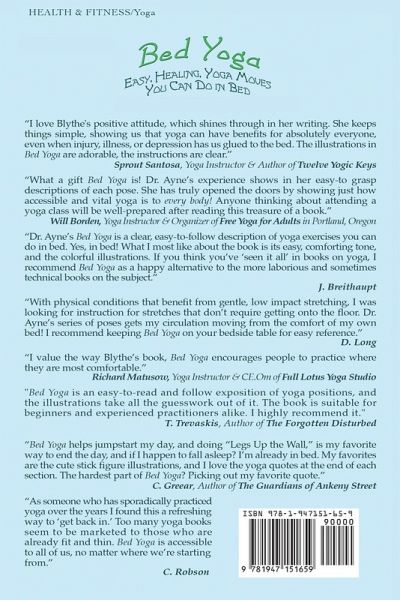 Bed Yoga: Easy, Healing, Yoga Move You Can Do in Bed LARGE PRINT EDITION Bed Yoga and You! Did you know that going through physical movements in your mind's eye causes your muscles to fire? It's super-good for you to start or finish your day with yoga poses in your mind, then moving into a gentle series in bed. Relaxing ... and healing! Greeting the day by waking up slowly, mentally going through a few yoga moves, then engaging in them physically is meditative and mindful. It nurtures you-body, mind, and spirit. A gentle series of yoga moves sets a calm and positive tone at the beginning of your day, and lets you relax into a deep and peaceful sleep at the end of your day. Whether you'll soon be up and out in rush hour traffic, or you're enjoying the day puttering around the house, or you're under the weather, spending a couple days in bed, or you're confined to bed for a longer period of time, Bed Yoga is good for you.