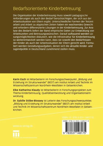 Die Organisation der Kinderbetreuung muss sowohl pädagogische Anforderungen als auch den Bedarf berücksichtigen, der sich aus der Arbeitssituation von Eltern ergibt. Unterschiedliche Formen der Teilzeitarbeit und Arbeit zu atypischen Zeiten haben ein wachsendes Gewicht und erfordern differenzierte Lösungen in der Kinderbetreuung. Zur Analyse des Bedarfs liefert der Band empirische Daten zur Entwicklung von Arbeitszeiten und Betreuungswünschen. Darauf aufbauend werden Lösungsmöglichkeiten diskutiert, wie die Infrastruktur für Kinderbetreuung so weiterentwickelt werden kann, dass sie sowohl den Bedürfnissen der Kinder als auch der Arbeitssituation der Eltern gerecht wird. Formuliert werden Gestaltungsaufgaben, denen sich die aktuelle Kinder- und Jugendpolitik in Deutschland zunehmend stellen