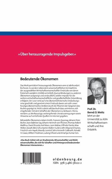 Das Werk porträtiert herausragende Ökonomen vom 17. Jahrhundert bis heute. Die Autoren wollen neben dem wissenschaftlichen Vermächtnis der ausgewählten Wirtschaftswissenschaftler Eindrücke von deren historisch-sozialem Umfeld vermitteln, Querverbindungen zu anderen Ökonomen aufzeigen und verdeutlichen, welche Impulse für die weitere wirtschaftswissenschaftliche und gesellschaftliche Entwicklung erfolgten. Der Leser wird auf eine ökonomiehistorische Entdeckungsreise geschickt und gewinnt einen Eindruck davon, wie sehr unser heutiges ökonomisches Denken durch die Theorien der Epigonen des Buches geprägt ist. Nicht zuletzt soll das Buch dazu animieren, sich eingehender mit dem Schaffen der Ökonomen zu befassen. Hierzu werden u.a. Werkauszüge, weitergehende Literaturanregungen sowie Hinweise auf vertiefende Quellen im Internet gegeben. Behandelte Ökonomen: Adam Smith, Francois Quesnay, Johann Peter Becher, Jean-Babtiste Say, Johann Heinrich von Thünen, Thomas Robert Malthus, David Ricardo, Karl Marx, Leon Walras, Vilfredo Pareto, Max Weber, Joseph Alois Schumpeter, Walter Eucken, John Maynard Keynes, Friedrich von Hayek, Wassily Leontief, John Kenneth Galbraith, Ronald H. Coase, Milton Friedman, Ludwig Erhard, Alfred Müller-Armack.
