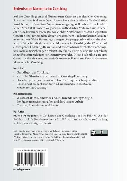 Auf der Grundlage einer differenzierten Kritik an der aktuellen Coaching-Forschung wird in diesem Open-Access-Buch eine Landkarte für die künftige Ausrichtung der Coaching-Prozessforschung vorgestellt. Als weiteres Ergebnis seiner Arbeit stellt Robert Wegener ein methodisches Verfahren zur Untersuchung «bedeutsamer Momente» vor. Ziel des Verfahrens ist es, dem Gegenstand Coaching und insbesondere dessen dynamischem und komplexem Charakter in besonderer Weise Rechnung zu tragen. Ausgangspunkt dafür ist das theoretische Verständnis «bedeutsamer Momente» im Coaching, das Wegener mit einer eigenen Coaching-Definition und verschiedenen psychotherapiebezogenen Forschungsrichtungen herleitet und für die Entwicklung und Erprobung seines Forschungsdesigns konsequent verwendet. Dieses Buch bildet eine erste Grundlage für eine programmatisch angelegte Forschung über «bedeutsame Momente» im Coaching.