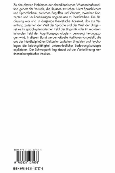 Zu den ältesten Problemen der abendländischen Wissenschaftstradition gehört der Versuch, die Relation zwischen Nicht-Sprachlichem und Sprachlichem, zwischen Begriffen und Wörtern, zwischen Konzepten und Lexikoneinträgen angemessen zu beschreiben. Die Bedeutung war und ist dasjenige theoretische Konstrukt, das zur Vermittlung zwischen der Welt der Sprache und der Welt der Dinge - sei es im sprachsystematischen Feld der Linguistik oder im repräsentationalen Feld der Kognitionspsychologie - bevorzugt herangezogen wird. In diesem Band werden aktuelle Positionen vorgestellt, die aus der interdisziplinären Diskussion zwischen Linguisten und Psychologen die Leistungsfähigkeit unterschiedlicher Bedeutungskonzepte explizieren. Der Schwerpunkt liegt dabei auf der Weiterführung kontinentaleuropäischer Ansätze.