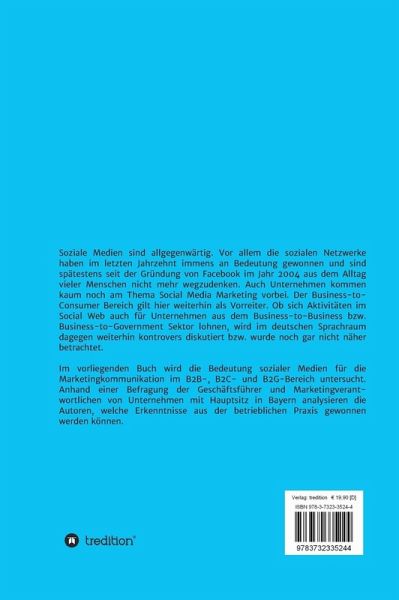 Im Buch wird die Bedeutung sozialer Medien für die Marketingkommunikation im B2B-, B2C- und B2G-Bereich untersucht. Anhand einer Befragung der Geschäftsführer und Marketingverantwortlichen von Unternehmen mit Hauptsitz in Bayern analysieren die Autoren, welche Erkenntnisse aus der betrieblichen Praxis gewonnen werden können.