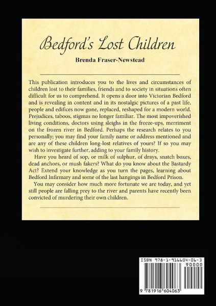 This publication introduces you to the lives and circumstances of many children lost to their families, friends and to society in situations often difficult for us to comprehend. It opens a door into Victorian Bedford and is revealing in content and in the nostalgic pictures of a past life, people and edifices now gone, replaced, reshaped for a modern world. Prejudices, taboos, stigmas no longer familiar. The most impoverished living conditions, doctors using sleighs in the freeze-ups, merriment on the frozen river in Bedford. Perhaps the research relates to you personally; you may find your family name or address mentioned and are any of these children long-lost relatives of yours? If so you may wish to investigate further, adding to your family history. Have you heard of sop, or milk of sulphur, of drays, snatch boxes, dead anchors, mush fakers? What do you know about the Bastardy Act? Extend your knowledge as you turn the pages, learn about the Bedford Infirmary and of some of the last hangings in Bedford Prison, public and private. You may consider how much more fortunate we are today and yet people are still falling prey to the river and parents have recently been convicted of murdering their own children.