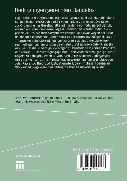 Legitimität und begründeter Legitimitätsglaube sind aus Sicht der liberalen politischen Philosophie nicht voneinander zu trennen: Die Regeln zur Ordnung einer Gesellschaft sind nur dann normativ gerechtfertigt, wenn die Bürger, die diesen Regeln unterworfen werden sollen, sie - prinzipiell - tatsächlich akzeptieren können, und zwar wegen der Gründe, die für sie sprechen. Daher muss es ein zentrales Anliegen liberaler Theoretiker sein, die Bedingungen zu untersuchen, unter denen gerechtfertigter Legitimitätsglaube entsteht und zum gerechten Handeln motiviert. Dabei sind folgende Fragen zu beantworten: Können Produkte der Vernunft - Rechtfertigungsgründe - den Wunsch erzeugen, gerechte Regeln zu befolgen? Wenn ja, wie? Und unter welchen Bedingungen führt der Wunsch zur Tat? Diese Fragen werden auf der Grundlage von John Rawls' "A Theory of Justice"