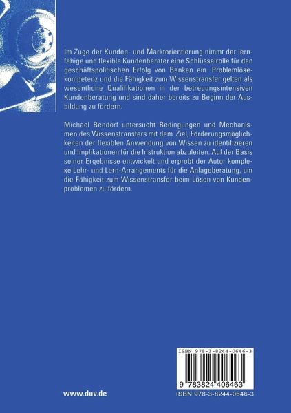 Michael Bendorf untersucht Bedingungen und Mechanismen des Wissenstransfers mit dem Ziel, Förderungsmöglichkeiten der flexiblen Anwendung von Wissen zu identifizieren und Implikationen für die Instruktion abzuleiten. Auf der Basis seiner Ergebnisse entwickelt und erprobt der Autor komplexe Lehr- und Lern-Arrangements für die Anlageberatung, um die Fähigkeit zum Wissenstransfer beim Lösen von Kundenproblemen zu fördern.