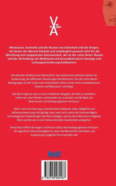 Die meisten Menschen haben eine verzerrte Vorstellung vom Begriff Vertrauen und was Vertrauen in Wahrheit bedeutet. Dabei verwechseln sie Vertrauen mit Kontrolle. Misstrauen, Kontrolle und die Illusion von Sicherheit sind die Drogen, mit denen der Mensch betäubt und empfänglich gemacht wird für die Domestikation und Abrichtung zum angepassten Konsumenten, der an der Leine dieses unwahren Denkens und der Verheißung von Wohlstand und Gesundheit durch Vorsorge und Leistungsorientierung funktionieren soll.Die Ego-Gesellschaft funktioniert scheinbar, aber sie entwickelt sich nicht weiter. Erst wenn der Einzelne den Irrtum erkennt und beginnt, die richtigen Fragen zu stellen, kommt der ausgebeutete und sich selbst ausbeutende Mensch den verhängnisvollen Mechanismen des politischen Systems und all seiner Subsysteme auf die Schliche. Entlang den gesellschaftlichen und politischen Gegebenheiten unserer Zeit deckt das Buch diesen Irrtum auf und beschreibt, warum nur bedingungsloses Vertrauen das Potenzial für eine Weiterentwicklung einer Gesellschaft birgt, die sich am Abgrund befindet, indem es auch demjenigen eine Chance gibt, der sich nicht durch Anpassung an das System auszeichnet, sondern sich vielmehr gegen die Gesellschaft gewendet hat. Die aktuellen Probleme der Menschheit, das existierende politische System, der Ausbeutungscharakter eines marktradikalen Neoliberalismus, die raffinierten Täuschungen der Menschen, die unter diesen Bedingungen auf der Suche nach individuellem Glück versuchen, zu überleben, sind vielfach beschrieben. Das Buch zeigt auf, dass es einen friedlichen Weg gibt, die Welt zu verändern, indem wir unser Denken und Handeln auf der Basis von Bewusstsein und bedingungslosem Vertrauen neu ausrichten. Wenn wir eine Orientierung zum Gemeinwohl, zur Solidarität aller und zu Liebe, Mitgefühl und Selbstverantwortung nicht schaffen, dann wird nicht zuletzt die Geschwindigkeit technologischer Entwicklungen den Rest erledigen, weil sie dem Menschenentgleitet. Dann werden wir in einer konkurrierenden Gesellschaft untergehen. Dieses Buch öffnet die Augen und Herzen dafür, dass bedingungsloses Vertrauen die eigentliche Alternativlosigkeit ist, wenn die Menschheit überleben und die Ausbeutung beenden will.