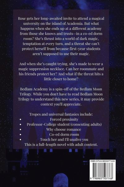 Rose gets her long-awaited invite to attend a magical university on the island of Academia. But what happens when she ends up at a different academy from those she knows and trusts-in a co-ed dorm room? She's thrust into a world of dark magic, temptation at every turn, and a threat she can't protect herself from because first-year students aren't supposed to use their magic. And when she's caught trying, she's made to wear a magic suppression necklace. Can her roommate and his friends protect her? And what if the threat hits a little closer to home? Bedlam Academy is a spin-off of the Bedlam Moon Trilogy. While you don't have to read Bedlam Moon Trilogy to understand this new series, it may provide context you'll appreciate. Tropes and universal fantasies include:Forced proximity Professor-College student (consenting adults) Why choose romance (the female main character has multiple love interests and does not have to choose between them) Co-ed dorm room Touch her and I'll unalive you This is a full-length novel with adult content.