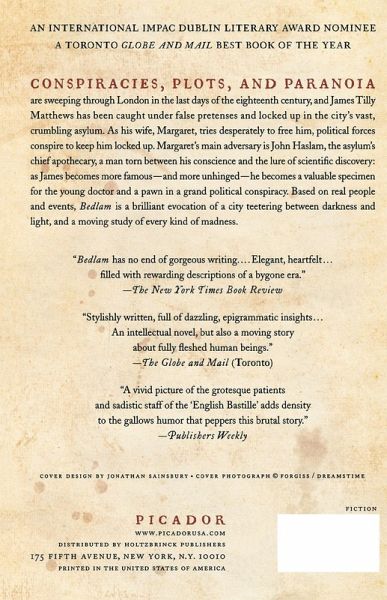 An International IMPAC Dublin Literary Award Nominee A Toronto Globe and Mail Best Book of the Year Conspiracies, plots, and paranoia are sweeping through London in the last days of the eighteenth century, and James Tilly Matthews has been caught under false pretenses and locked up in the city's vast, crumbling asylum. As his wife, Margaret, tries desperately to free him, political forces conspire to keep him locked up. Margaret's chief adversary is John Haslam, the asylum's chief apothecary, a man torn between his conscience and the lure of scientific discovery: as James becomes more famous--and more unhinged--he becomes a valuable specimen for the young doctor and a pawn in a grand political conspiracy. Based on real characters and events, Bedlam is a brilliant evocation of a city teetering between darkness and light, and a moving study of every kind of madness.
